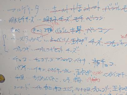 次の難関は、トッピングを何にするか。前日から激しい議論が戦わされました。何を何種類作るのか、何枚作るのか、いかに価格を抑えるか、それでいていかにおいしく仕上げるか。チーズにこだわる人、ピザソースにこだわる人、辛さにこだわる人、パイナップルとチキンがうまいと主張する人、果てはチョコとバナナを使ってデザート風ピザを作ろうと言い張る人…。こだわりどころがそれぞれに違い、これまた実に愉快。ほとんど全員が作ろうと言ったのは、クワトロフォルマッジでした。しかしこのピザは、ゴルゴンゾーラ、モツァレラ、パルミジャーノ、ゴーダ+はちみつを使う超ぜいたく品です。これだけそろえるとそれだけで値段が跳ね上がる。議論の末、一部普通のミックスチーズを使うことになりました。