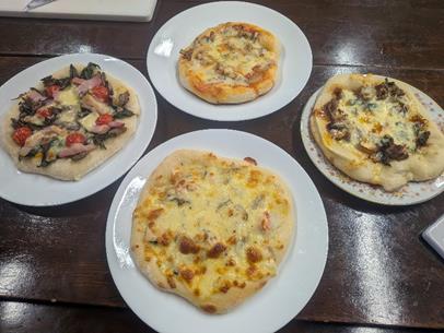 まんまるにはなりませんでしたが、焼き上がりは見事。左下のオーブン上のピザは、タッカルビとプルコギという韓国風のものです。これはもうピザの域を超えています。合計で10種類以上作ったでしょう。初めは無謀に思われましたが、やってみれば意外と簡単。案ずるより生むがやすしですね。